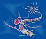 La myéline est une membrane biologique qui s’enroule autour des axones pour constituer une gaine. Pour mémoire, un axone est le prolongement unique par lequel un neurone communique avec sa cellule cible.
