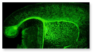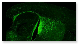 Figure 1 : Coupe histologique du cerveau de souris témoin. La myéline et les cellules myélinisantes (oligodendrocytes) ont été rendues fluorescentes à l’aide d’un gène codant pour une protéine de fluorescence verte (GFP) afin de faciliter l’identification et le suivi de la destruction de la myéline et sa réparation.