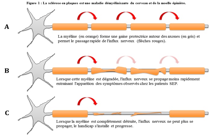 La sclérose en plaques (SEP) est une maladie chronique inflammatoire affectant environ 80.000 personnes en France et entre 2 et 2,5 millions dans le monde. Première cause de handicaps moteurs du jeune adulte, après ceux consécutifs à un accident, elle touche le cerveau, la moelle épinière et les nerfs optiques. Elle est la conséquence d’une attaque incontrôlée par le système immunitaire de la gaine de myéline entourant les fibres nerveuses. Cette gaine, nécessaire à la propagation du signal nerveux, est alors détruite, entrainant l’apparition de certains symptômes tels que des troubles de la vue, une faiblesse musculaire ou des engourdissements (Figure 1).