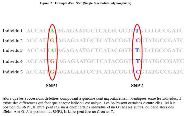 Le patrimoine génétique est constitué d’une succession de 3,2 milliards de lettres, les fameuses A, C, G et T. La différence entre deux individus pris au hasard dans la population se fait sur 0,1% du génome, soit environ 3 millions de lettres. Certaines de ces différences sont dues à des « variants », les SNPs (Single NucleotidePolymorphisms) (Figure 2), qui résultent de la possibilité d’avoir, à une position donnée du génome, un choix de 2 lettres ou « allèles ».